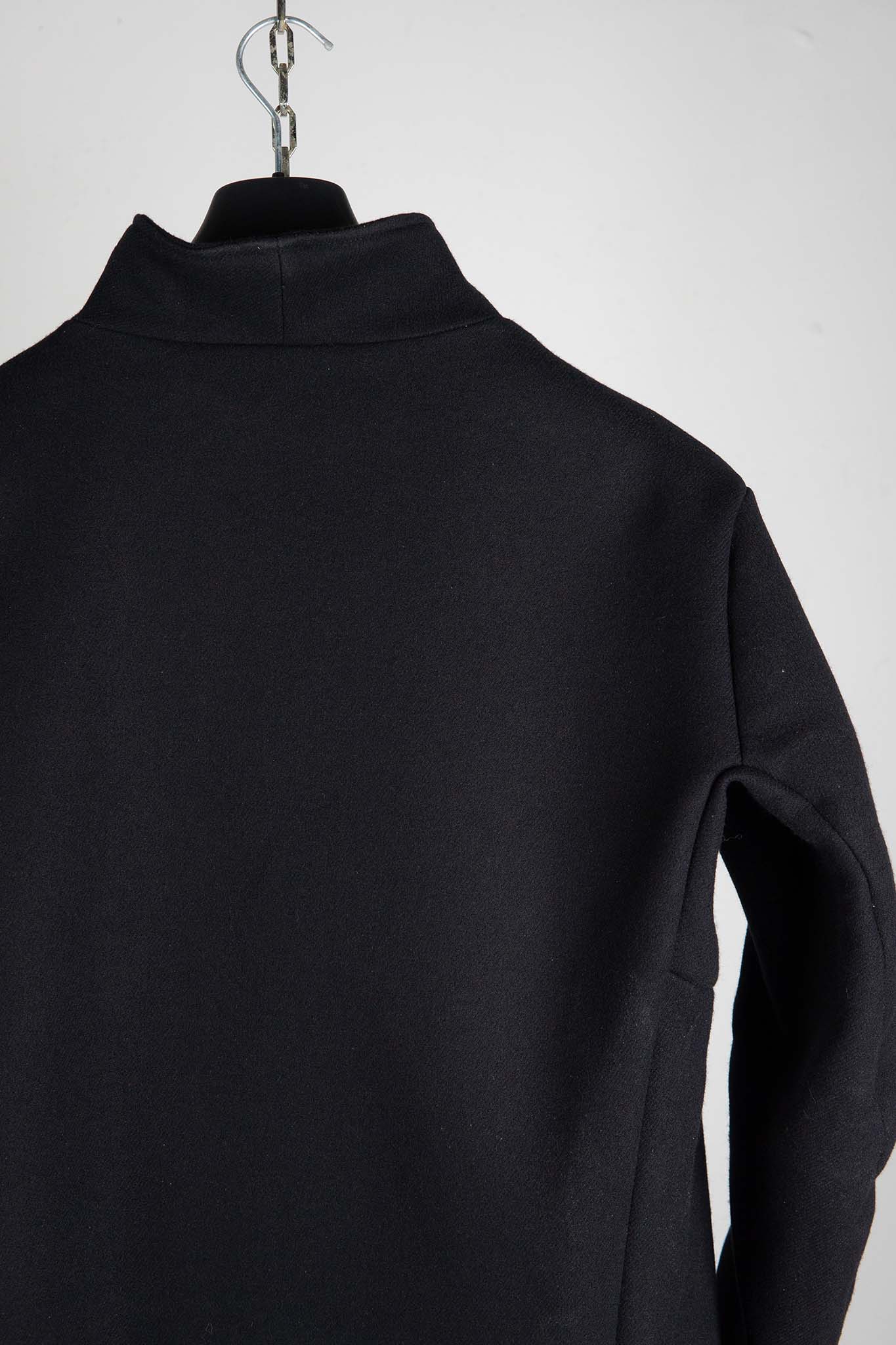バイアスに走るハイネックと比翼仕立てが生み出すラインは、ミニマルな美しさを引き立てる一着です。