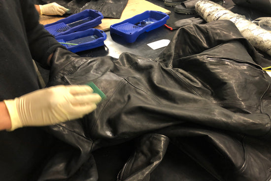 太鼓で染料と共に回され染色が終わった製品はタンナーで水気を落とした後濡れたままラボに持ち帰られ次の工程へ進む。